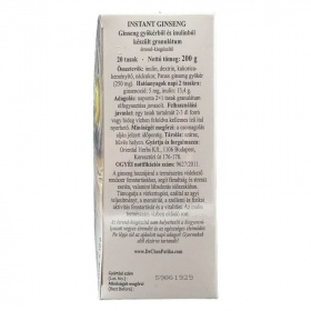 A ginseng segít a szellemi és fizikai frissesség megőrzésében, támogatja az immunrendszert. Serkentőleg hat az egész szervezetre, mozgósítja annak energiáit. Betegségek utáni lábadozáskor hasznos kiegészítés. A forró és hideg vízben egyaránt feloldható instant tea az év minden szakában kellemes frissítő. Naponta 1-2 csésze tea fogyasztása javasolt.