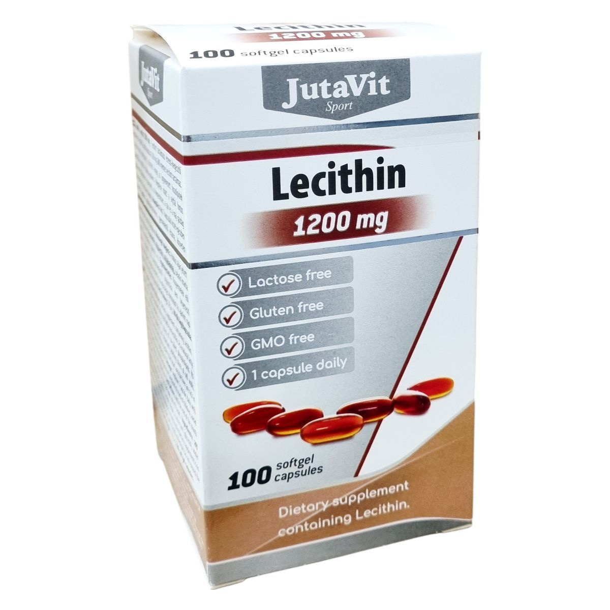 A JutaVit Lecitin kapszula 1200 mg GMO mentes lecitin tartalmú étrend-kiegészítő készítmény, amely a természetes zsírszerű anyagok, a foszfolipidek csoportjába tartozik. Poláros-apoláros szerkezete miatt a sejtfal fontos alkotórésze, különösen gazdag benne a csontvelő, az idegrendszer, a szív és a máj. A lecitin fő forrása a szójaolaj. A termék kizárólag természetes összetevőket tartalmaz, mint a szójalecitin, szójaolaj, marha eredetű zselatin, glicerin és víz. A termék 100 lágykapszulát tartalmaz, nettó tömege 179,6 g. Az adagolás napi 1 kapszula, mely vízzel egészben lenyelendő. A termék tárolása szobahőmérsékleten történjen, eredeti csomagolásban, gyermekektől elzárva, napfénytől védve. Az étrend-kiegészítő nem helyettesíti a változatos étrendet és az egészséges életmódot, és nem alkalmas gyermekek számára.