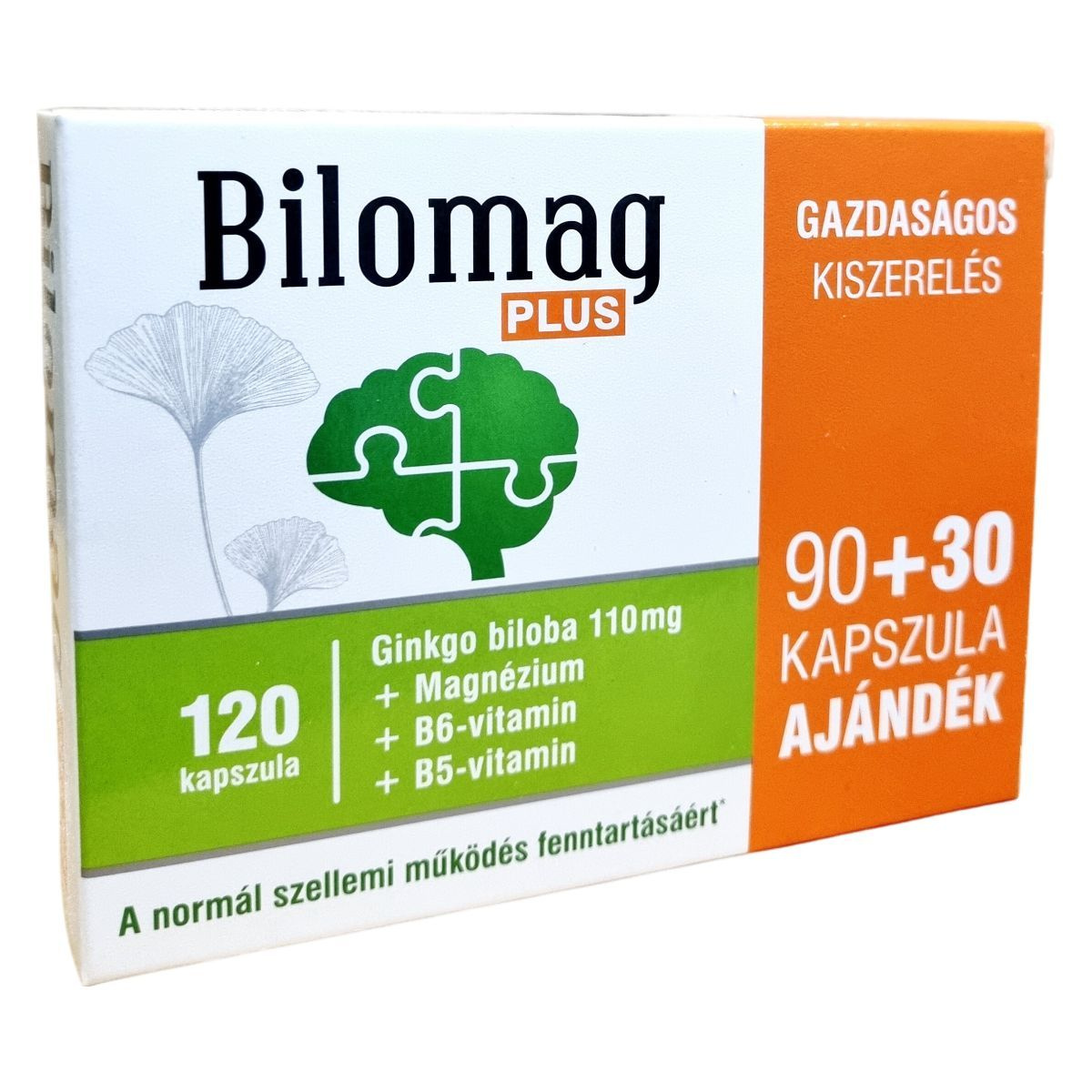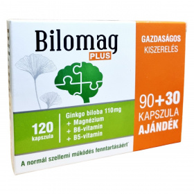 A Bilomag PLUS egy gazdaságos kiszerelésű étrend-kiegészítő, amely 110 mg Ginkgo biloba kivonatot, magnéziumot, B6- és B5-vitamint tartalmaz. A Ginkgo biloba hozzájárulhat a normál vérkeringéshez, beleértve az agyi vérkeringést, és támogathatja a normál szellemi működést, mint például a memória és a tanulás. A magnézium és a B6-vitamin segíthet az idegrendszer megfelelő működésében, míg a B5-vitamin hozzájárulhat a normál mentális teljesítményhez. A termék 90+30 kapszulát tartalmaz, amely ajándékként is szolgálhat. Fontos, hogy a termék alkalmazása előtt konzultáljon orvosával, különösen, ha gyógyszereket szed.