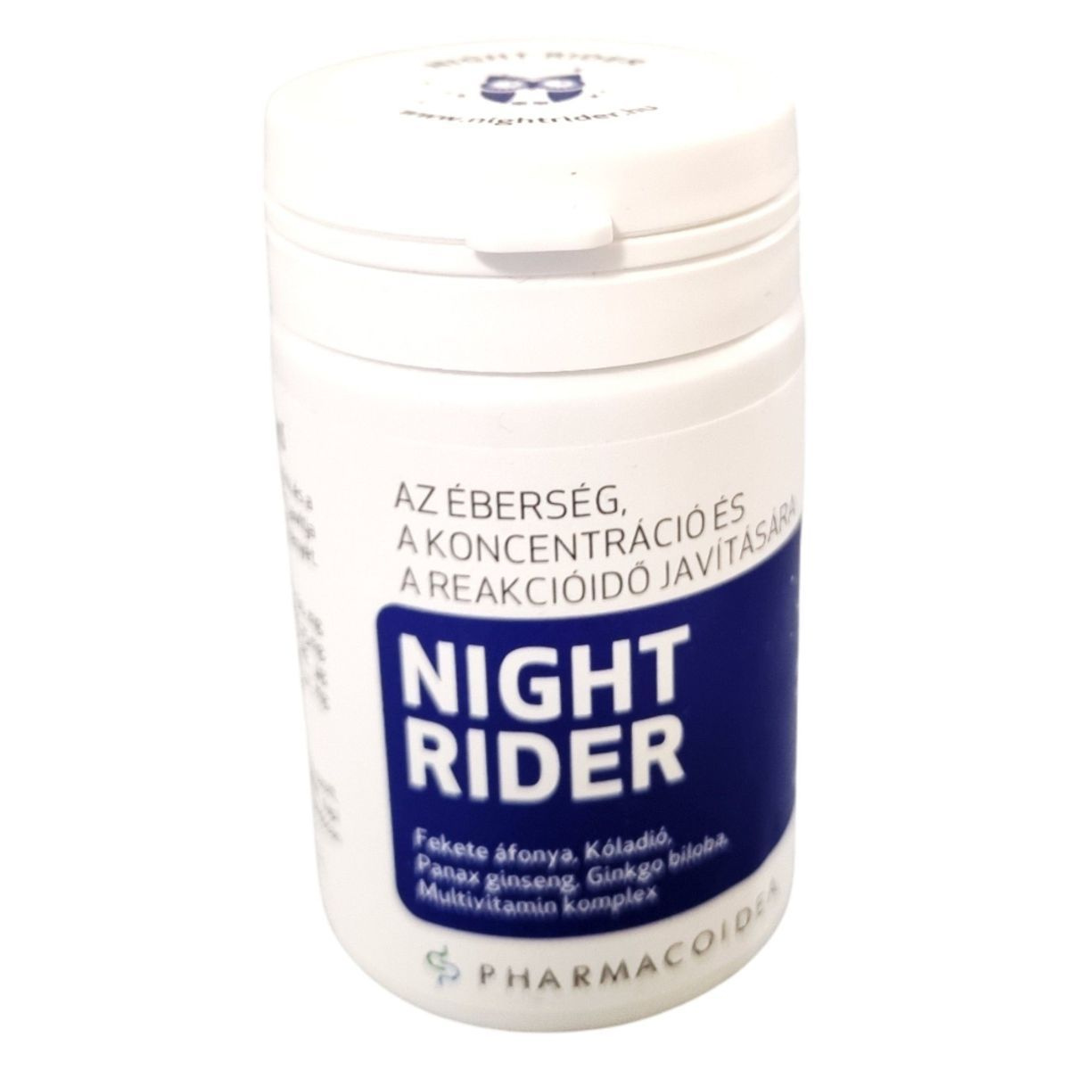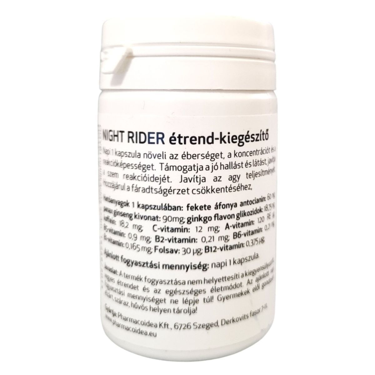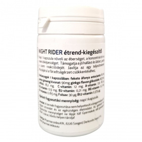 A NIGHT RIDER étrend-kiegészítő célja, hogy támogassa az éberséget, a koncentrációt és a reakcióképességet. A termék fekete áfonya, kóladió, panax ginseng és ginkgo biloba kivonatokat tartalmaz, amelyek hozzájárulhatnak a fáradtságérzet csökkentéséhez és az agy teljesítményének javításához. A multivitamin komplex részeként C-vitamin, A-vitamin, valamint különböző B-vitaminok találhatók benne, amelyek segíthetnek a szervezet megfelelő működésének fenntartásában. A termék fogyasztása nem helyettesíti a kiegyensúlyozott étrendet és az egészséges életmódot, és az ajánlott napi mennyiséget nem szabad túllépni.