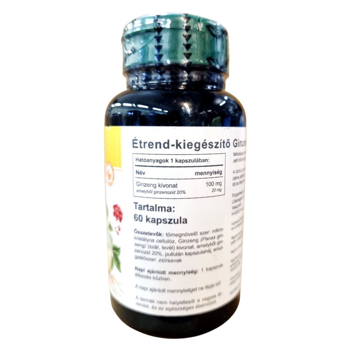 tömegnövelő szer: mikrokristályos cellulóz, Ginzeng (Panax ginseng) (szár, levél) kivonat, amelyből ginzenozid 20%, pullulán kapszulahéj, csomósodást gátló: zsírsavak