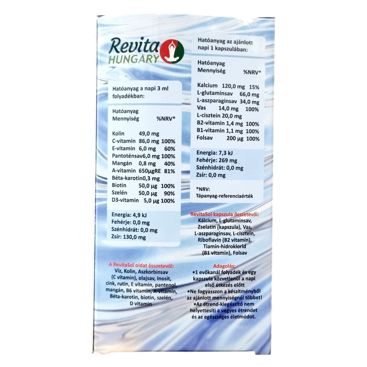 RevitaSol kapszula összetevői: Kálcium, L-glutaminsav, Zselatin (kapszula), Vas, L-aszparaginsav, L-cisztein, Riboflavin (B2 vitamin), Tiamin-hidroklorid (B1 vitamin), Folsav. RevitaSol oldat összetevői: Víz, Kolin, Aszkorbinsav (C vitamin), Olajsav, Inosit, Cink, Rutin, E vitamin, Pantenol, Mangán, B6 vitamin, A-vitamin, Béta-karotin, Biotin, Szelén, D vitamin.