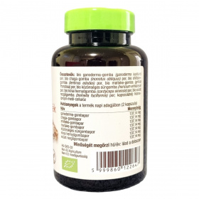 A BioMenü 7-Gomba keverék kapszula 60 darab 600 mg-os kapszulát tartalmaz. A termék származási helye Kína, a gombák biológiai minősítéssel (HU-ÖKO-02) rendelkeznek, és nem EU mezőgazdaságból származnak. A kapszulahéj hidroxpropil-metil-cellulózból készül, ami megfelel a vegán étrendnek. A termék organikus és nyers minősítésű, 100%-ban tiszta gombaporokat tartalmaz, amelyek számos fajta gombát foglalnak magukban, mint a ganoderma lucidum, inonotus obliquus, lentinus edodes, grifola frondosa, hericium erinaceus, cordyceps sinensis és tremella fuciformis. A kapszula napi adagja, azaz 2 kapszula, egyformán tartalmaz mind a hét gombafaj porát, mindegyiket 137,14 mg mennyiségben. A termék a természetesség és a minőség garanciájával bír, valamint minden kapszula vegán barát. Az ajánlott mennyiség betartása javasolt, és a termék nem helyettesíti az egészséges életmódot és a kiegyensúlyozott étrendet.