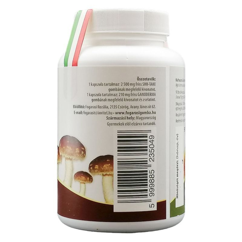 A kapszulák nem tartalmaznak egyéb adalékanyagokat csak shiitake és ganoderma gomba kivonatot, zselatint is csak a kapszula anyagának megfelelő mennyiségben! A kivonat ebben az esetben sem külföldi termék, saját gombából készül! A 90db kapszula 230 g friss shiitake gombának megfelelő, illetve 19 g friss ganoderma (pecsétviasz) gombának megfelelő kivonatot tartalmaz! A javasolt napi adagolás 3x 1-2 darab kapszula. OÉTI száma: 11466/2012.