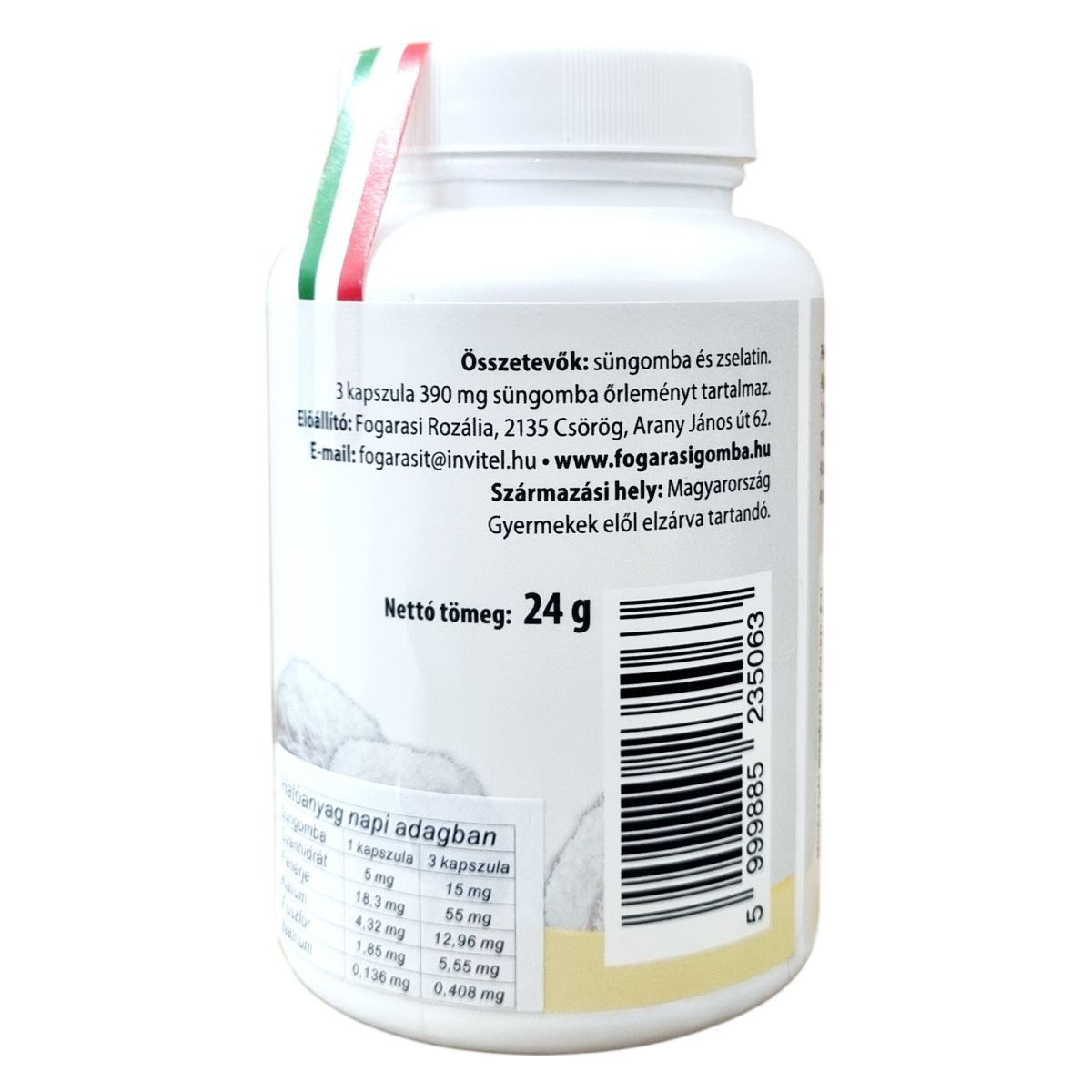 A Fogarasi Gomba Süngomba kapszula Magyarországon készül és 100 darab kapszulát tartalmaz, melyek 130 mg süngomba őrleményt tartalmaznak kapszulánként. A terméket zselatin kapszulába töltik, tartósítószert nem tartalmaz. A nettó tömeg 24 gramm. A termék minőségét a címkén feltüntetett dátumig megőrzi. Kapcsolattartási információk alapján a gyártó elérhető e-mailben.