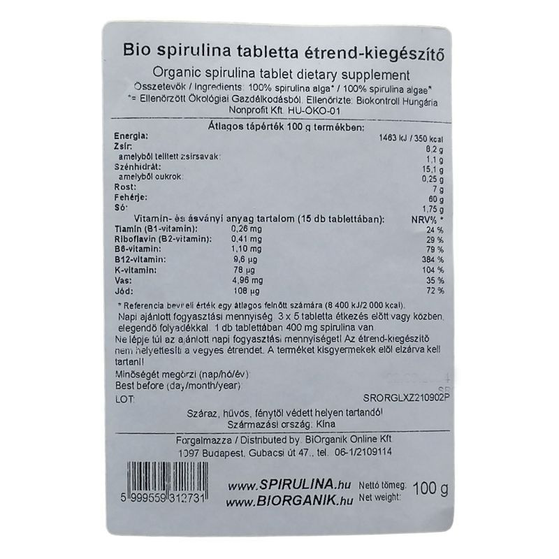 Összetevők: 100% spirulina alga*. *= Ellenőrzött Ökológiai Gazdálkodásból. Ellenőrizte: Biokontroll Hungária Nonprofit Kft. HU-ÖKO-01.