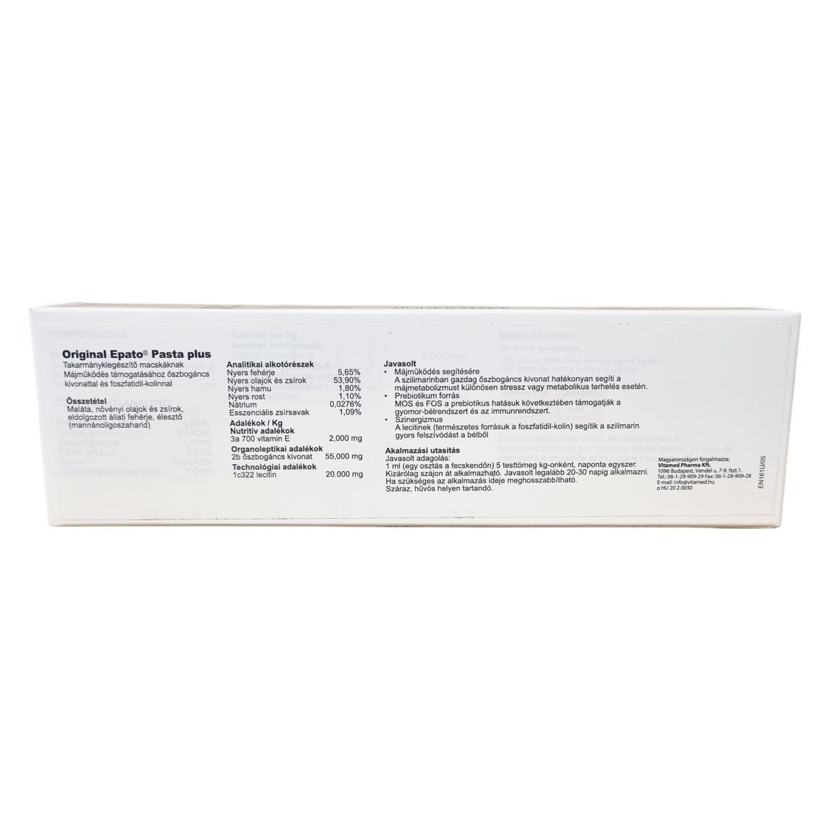 Az ORIGINAL EpatoPastaPlus egy takarmánykiegészítő macskák számára, mely elősegítheti a májműködést. Hatóanyagai között található szilimarinban gazdag őszbogáncs kivonat, amely különösen stressz vagy metabolikus terhelés esetén támogathatja a máj normál anyagcseréjét. Az élesztőtermékek (MOS) prebiotikus hatását kihasználva segíthetik a gyomor-bélrendszer, valamint a helyi immunrendszer működését. A lecitinek, amelyek természetes foszfatidil-kolin források, elősegíthetik a szilimarin hatékonyabb felszívódását a bélből. A termék kizárólag szájon át alkalmazható, javasolt legalább 20-30 napos használata, ami szükség esetén meghosszabbítható. A készítményt hűvös, száraz helyen kell tartani. A termék Olaszországban készült, környezetbarát csomagolásban, amely a szakszerű hulladékgyűjtési előírásokat betartva kezelendő.