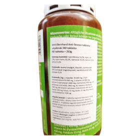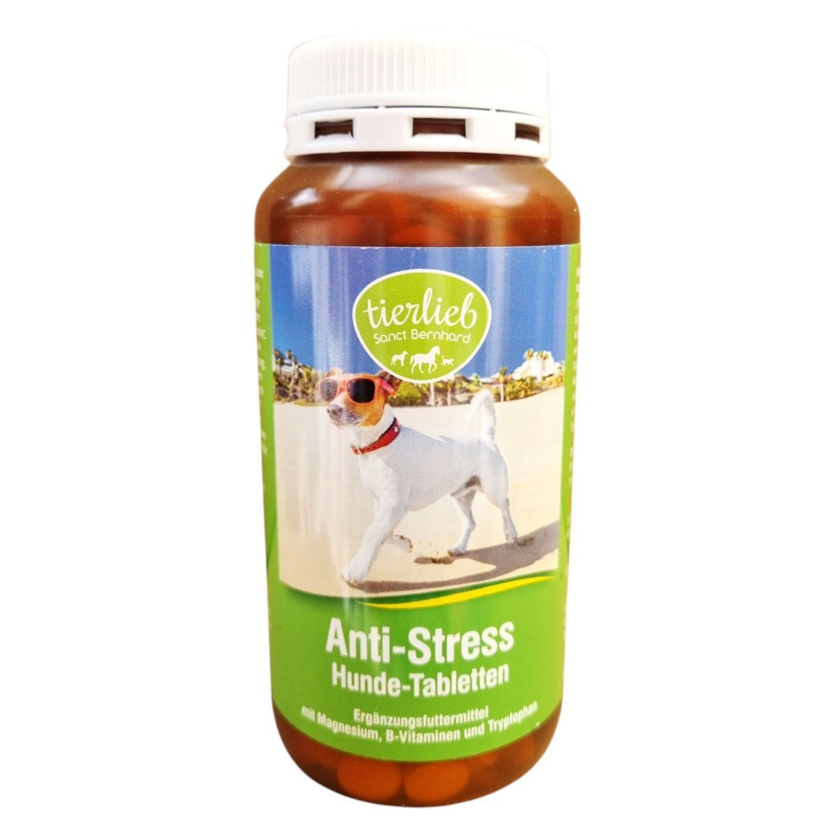 A Sanct Bernhard Anti-Stressz tabletta kutyáknak kifejlesztett étrend-kiegészítő, amely magnéziumot, B-vitaminokat és triptofánt tartalmaz. Ezek az összetevők hozzájárulhatnak a stresszes helyzetek kezeléséhez, mint például az egyedüllét, zajok vagy utazás. A termék kamilla és gyömbér kivonatot is tartalmaz, amelyek szintén támogathatják a nyugodt viselkedést. A tabletták adagolása testtömeg alapján történik, és javasolt a stresszes helyzet előtt fél órával beadni. A termék használata előtt ajánlott állatorvosi konzultáció, és nem javasolt más étrend-kiegészítőkkel vagy gyógyszerekkel együtt alkalmazni.