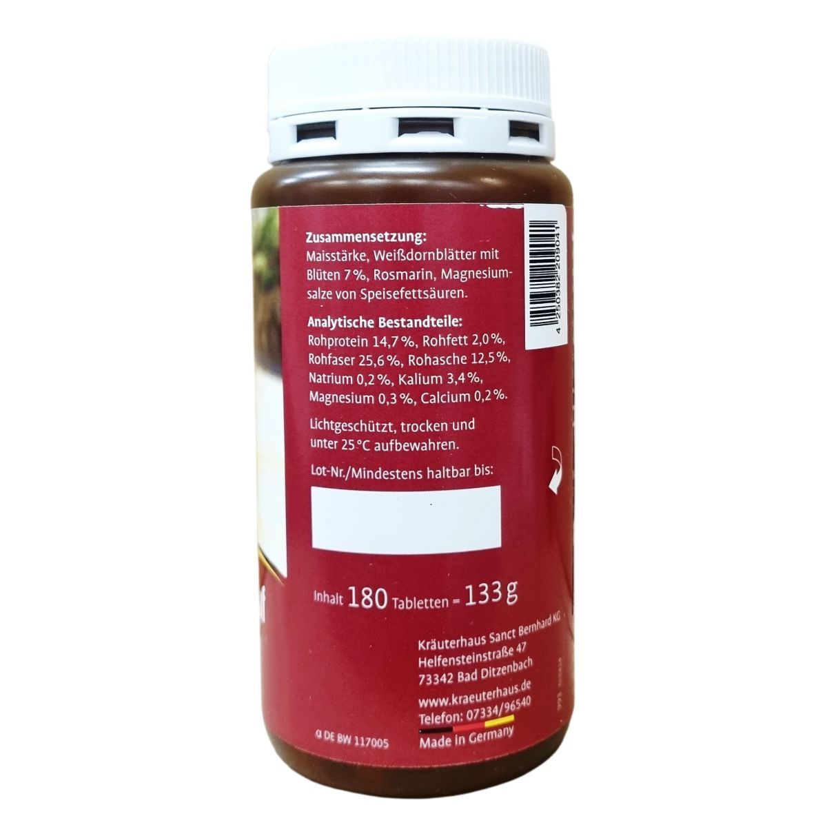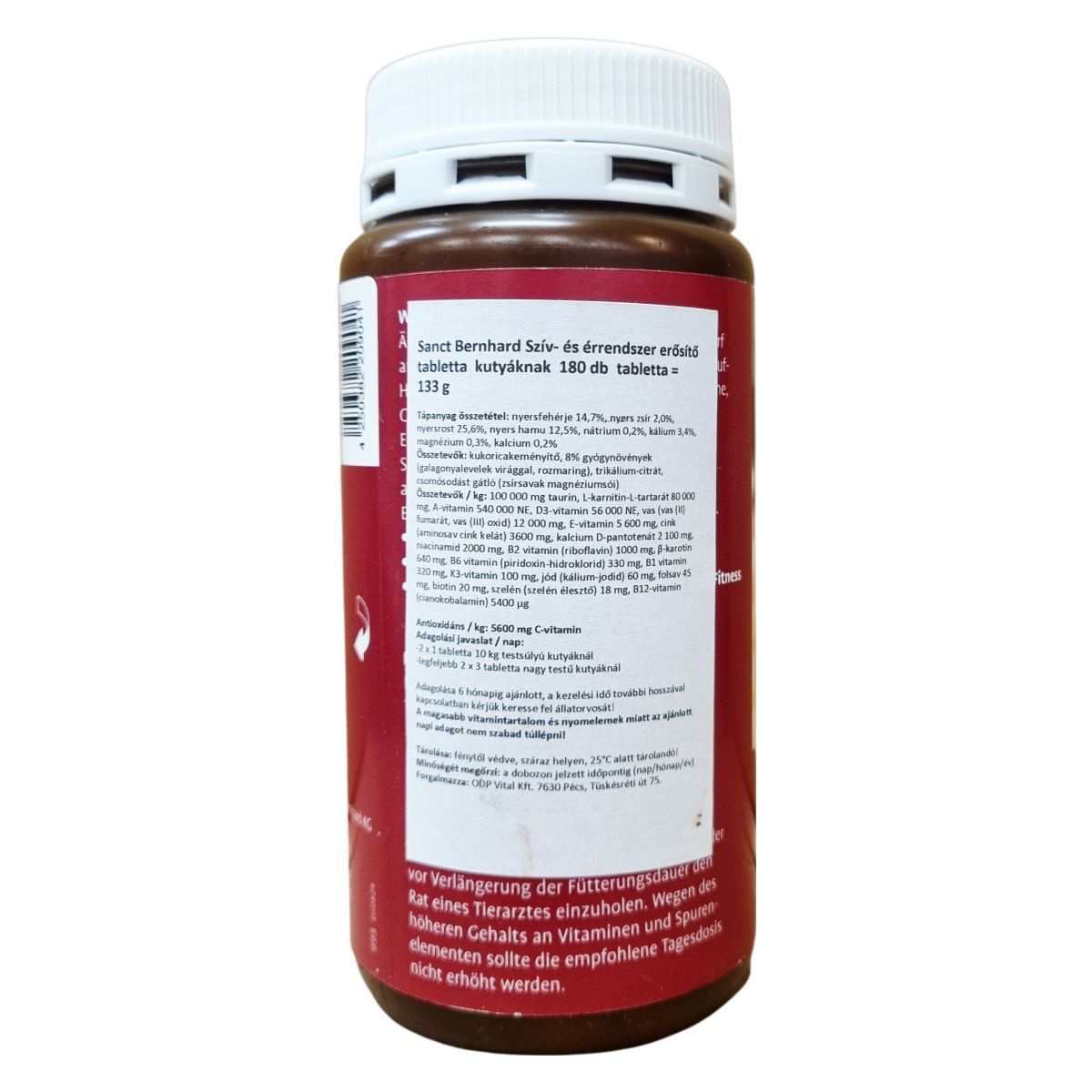 A Sanct Bernhard Szív- és érrendszer erősítő tabletta kiegészítő táplálékként készült idősebb kutyák számára, amely a galagonya és rozmaring mellett fontos vitaminokat, ásványi anyagokat és nyomelemeket tartalmaz. A tabletták összetétele magában foglal kukoricakeményítőt, galagonya leveleket virággal, rozmaringot, valamint magnézium sókat és trikálium-citrátot. Az antioxidáns tartalom részét képezi a C-vitamin. Az adagolásnál figyelembe kell venni a kutya testsúlyát, és a kezelést legfeljebb 6 hónapig javasolt folytatni, további időszakban a veterán szakvéleménye ajánlott. A termék a megfelelő tárolási feltételek mellett őrzi meg minőségét.