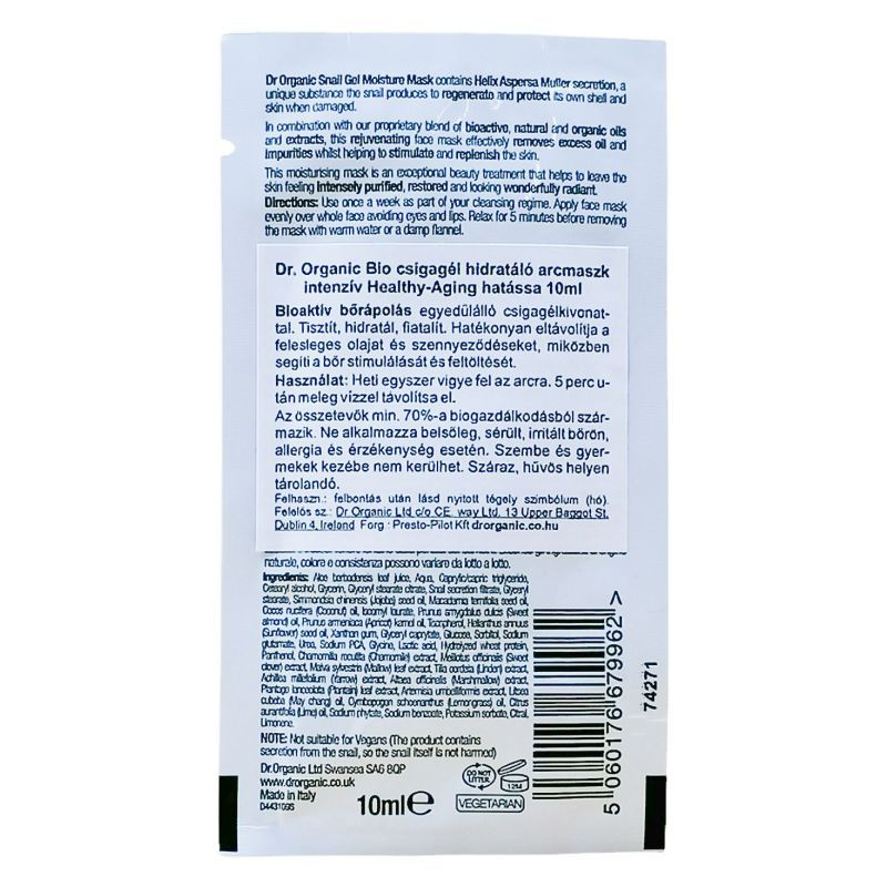 Mélyen behatol a bőrbe, hatékonyan eltávolítja a szennyeződéseket, támogatja a sejtregenerációt, ragyogóvá teszi az arcbőrt. Használat: hetente kétszer vigye fel az arcra, elkerülve a szemek és száj környékét. 10 perc után langyos vízzel, nedves vattakoronggal távolítsa el. A Dr. Organic csigagél-termékcsalád a Helix Aspersa Müller kivonatának kiemelkedő tulajdonságait használja fel, amelyekkel sérülés esetén a csiga saját házát és bőrét építi újra.