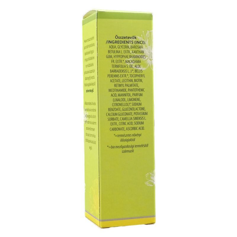 A Barosma betulina és a homoktövis kivonatának hatóanyagaival, a biotin és az A-vitaminok, valamint az aloe kellemesen tónusos, harmonikus bőrállapot kialakulását segíti elő. Alkalmazása: bármely napszakban vékony rétegben felvisszük a megtisztított, ápolandó arcbőrre. Miért környezetbarát, öko termék: nem tartalmaz szintetikus színezékeket és illatanyagokat, S.L.S mentes, a felhasznált alapanyagokkal és gyártott termékekkel nem végeztek állatkísérleteket, Magyarországon gyártott termék. Kiszerelés: 30 ml.