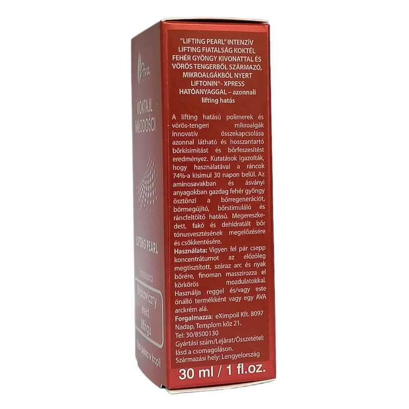 A technológiailag fejlett lifting polimerek és a Vörös-tengeri mikroalgák komplexumának köszönhetően az in vivo tesztek 74%-os ránccsökkentést mutattak 30 nap alatt! A fehér gyöngykivonat, aminosavakat, valamint ásványi anyagokban gazdag összetevők serkentik a regenerációt és kisimítják a bőrt, mely láthatóan megújul és sugárzóbb lesz. Minden bőrtípusra használható. Összetevők: Liftonin-Xpress & White Pearl. Felhasználás: néhány csepp koncentrátumot vigyünk fel az arc és a nyak alaposan megtisztított és szárított bőrére. Hajtson végre finom masszázst körkörös mozdulatokkal. A kedvenc AVA krémével használhatja reggel és este.