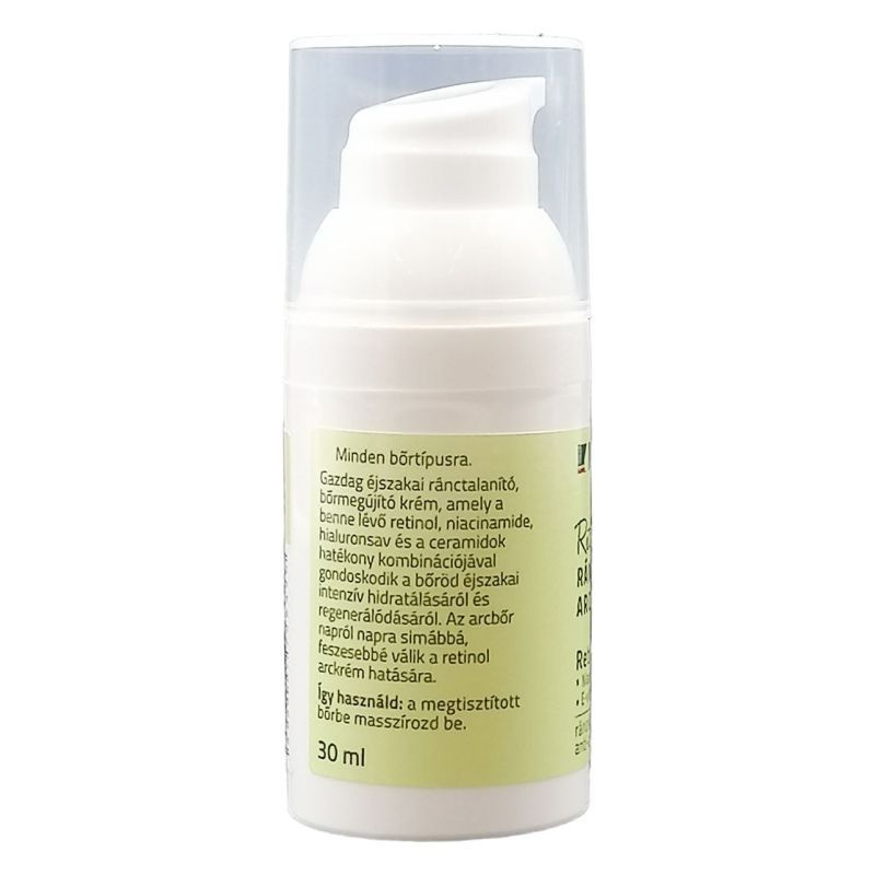 Magas hatóanyagtartalmú éjszakai ránctalanító, bőrmegújító krém, amely a benne lévő retinol, niacinamide, hialuronsav és a ceramidok kombinációjával gondoskodik a bőr intenzív hidratálásáról és regenerálódásáról.