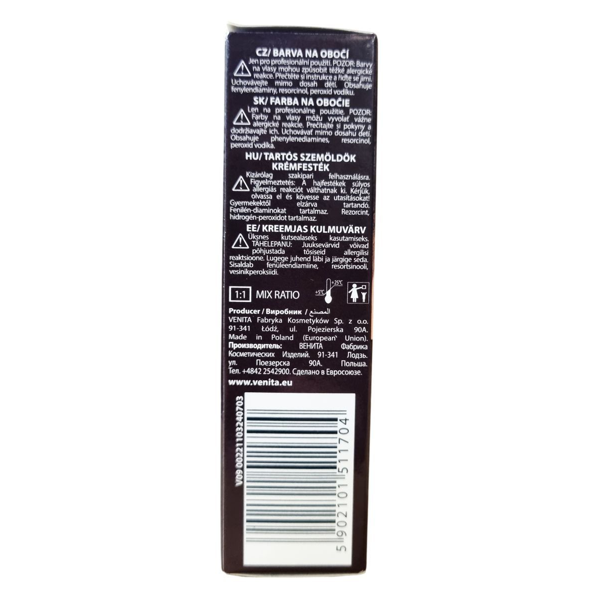 Tartós szemöldök krémfesték professzionális használatra. Hosszan tartó, vízálló színt ad, pontosan meghatározza és kiemeli a szemöldök formáját. A termék kétoldalas applikátorral rendelkezik, és akár 15 festéshez is elegendő. A csomag tartalma: 15 g színező krém, 15 g aktivátor, applikátor és használati utasítás. A festék és az aktivátor keverési aránya 1:1. A termék +5 °C és +25 °C közötti hőmérsékleten használható. Gyártva Lengyelországban, az Európai Unióban. A gyártási tételszám és a minőségmegőrzési idő a csomagoláson található.