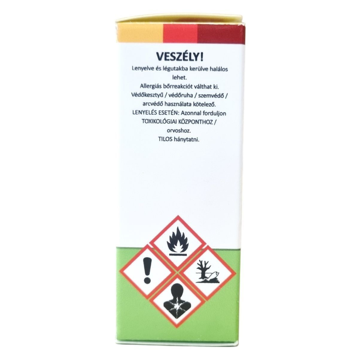 Veszély! Lenyelve és légutakba kerülve halálos lehet. Szakszerűen védőkesztyű, védőruha, szemvédő és arcvédő használata kötelező. Lenyelés esetén azonnal forduljon toxikológiai központhoz vagy orvoshoz, tilos hánytatni.