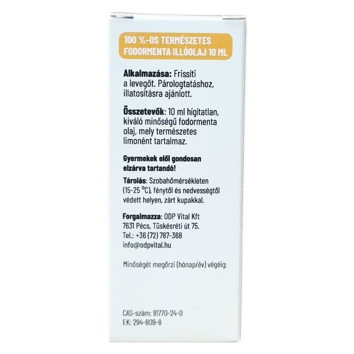 10 ml hígítatlan, kiváló minőségű fodormenta olaj, természetes limonén.