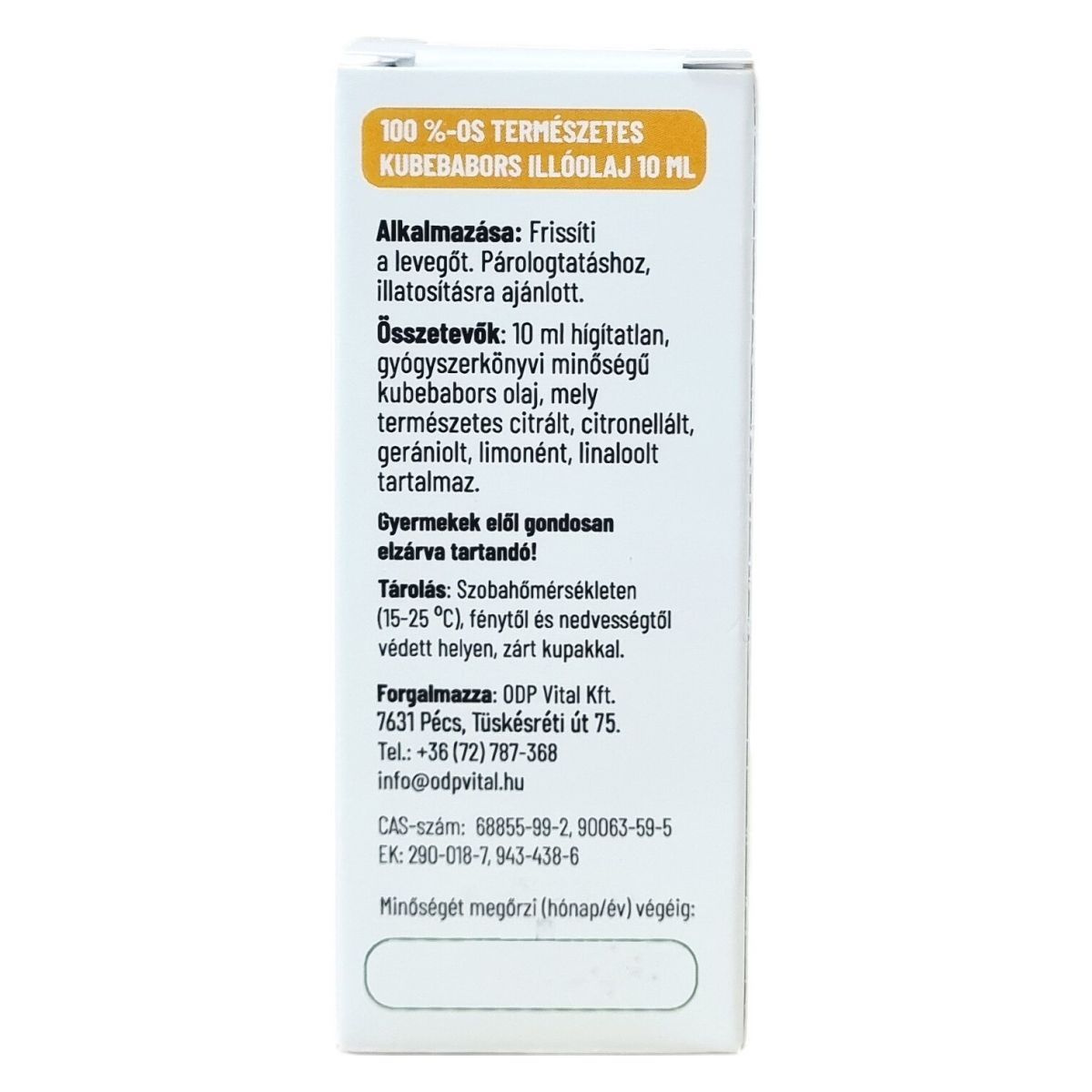 10 ml hígítatlan, gyógyszerkönyvi minőségű kubebabors olaj, mely természetes citrált, citronellált, geraniolt, limonént, linaloolt tartalmaz