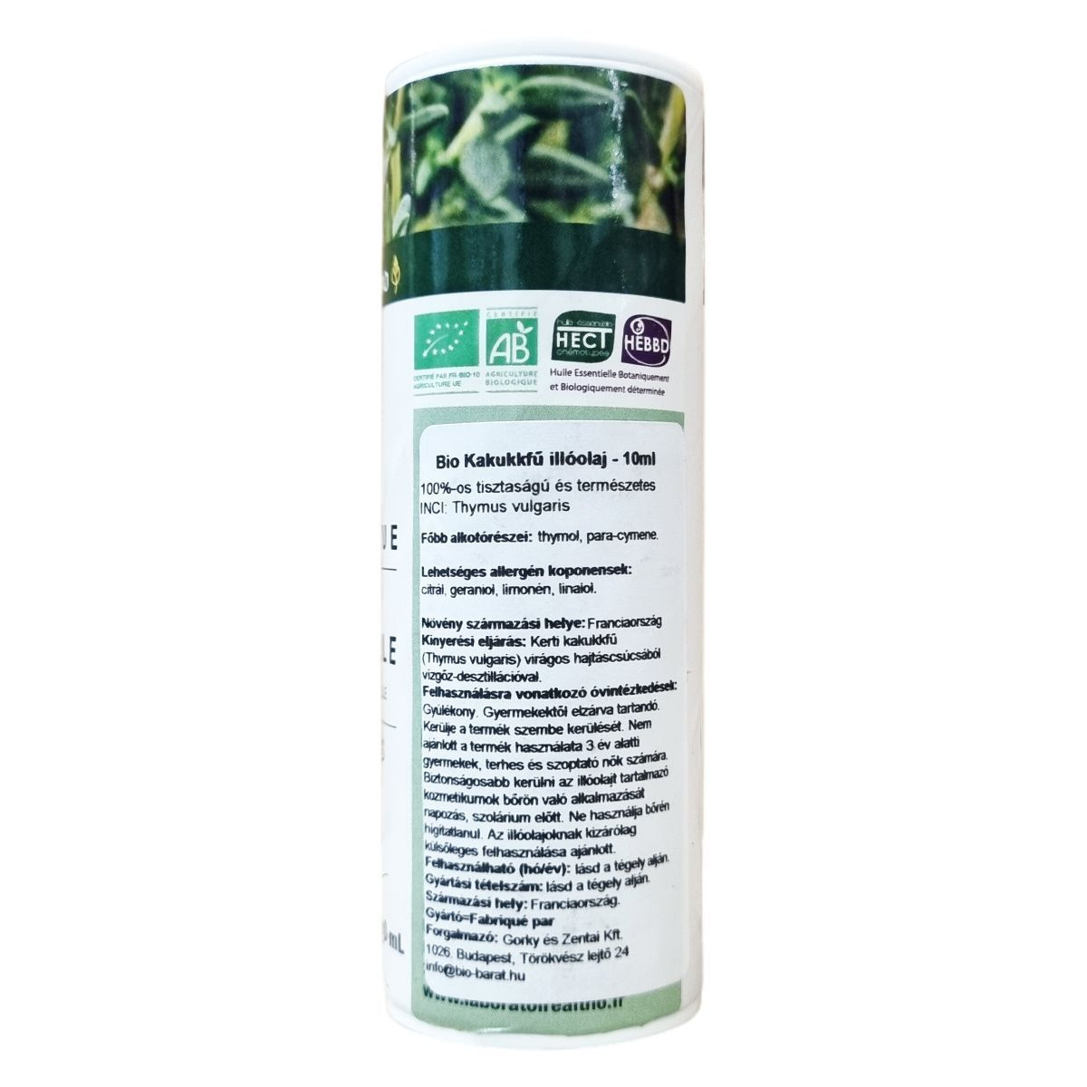 A bio kakukkfű illóolaj Kerti kakukkfű (Thymus vulgaris) virágos hajtáscsúcsából vízgőz-desztillációval nyert, franciaországi származású természetes termék. A növény származási helye Franciaország, a gyártási tételszám és a felhasználhatóság részletei a tégely alján találhatók. A termék botanikailag és biológiailag meghatározott, 100%-os tisztaságú, és kizárólag külsőleges alkalmazásra javasolt.