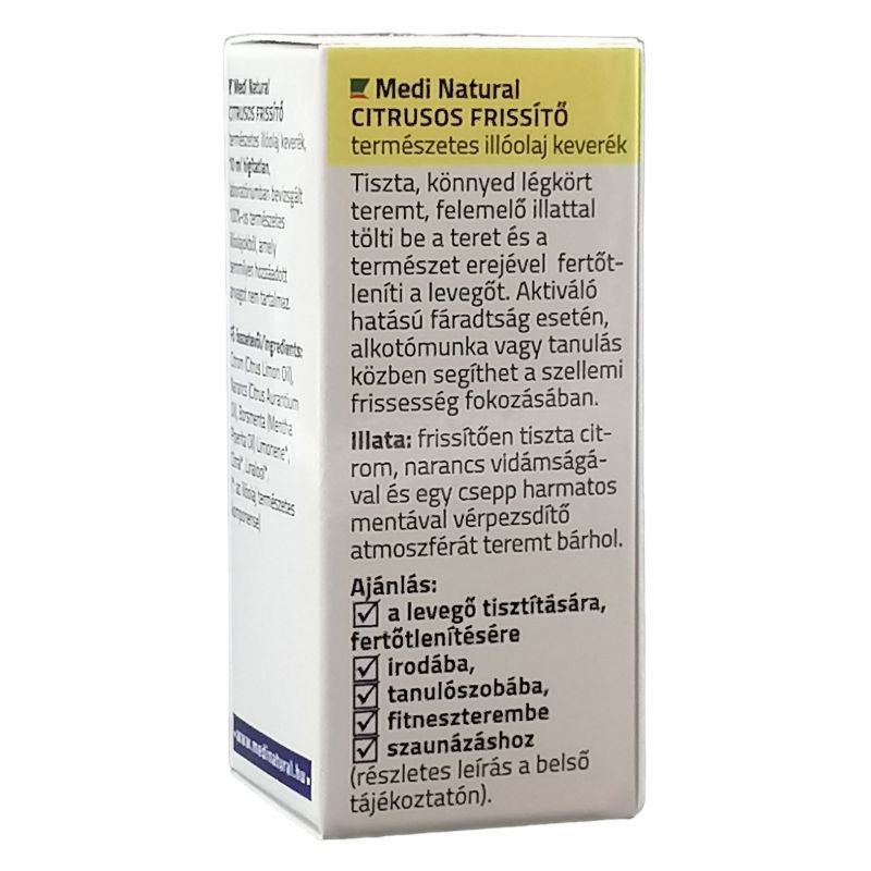 A benne levő citrusféléknek köszönhetően a stressz oldásban segít, felvidít, tiszta, könnyed légkört teremt, felemelő illattal tölti be a teret és a természet erejével fertőtleníti a levegőt. Használhatod otthon és a munkahelyeden is, leginkább párologtatva vagy az üvegből megszagolva. Aktiváló hatású fáradtság esetén, alkotómunka vagy tanulás közben segíthet a szellemi frissesség fokozásában. Kitűnő választás autó illatosítóként az éberség fokozására!