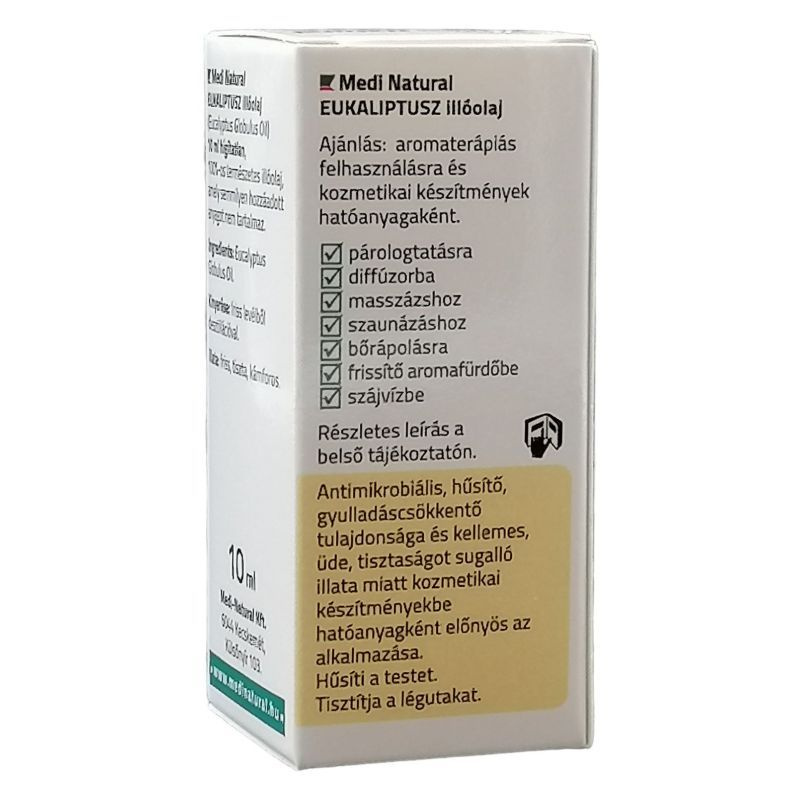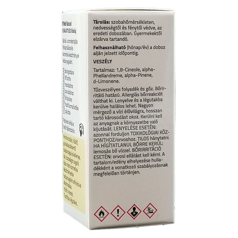 Ez az illóolaj az eukaliptusz leveleiből nyerhető, és erős, mentolos illatával azonnal képes felfrissíteni a környezetet. Jól ismert gyulladáscsökkentő hatásáról, amely segít a légutak tisztításában és a köhögés enyhítésében. Aromaterápiás alkalmazásával nemcsak a fizikai, hanem a mentális frissesség is javul.