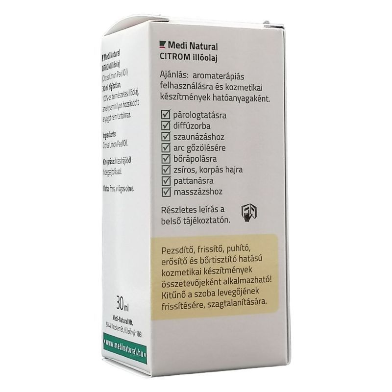 A citrom illóolaj kincs a szépségnek és léleknek egyaránt. Nem csak aromaterapeuták esetében alapvető része a készletnek, de bármely háztartásban, kozmetikában alkalmas a mindennapos használatra. A MediNatural citrom illóolaj illata miatt, valami tisztára, makulátlanra emlékezteti az embert. Érdekes, hogy nyugtat, de mégis elképesztően frissítő hatása van, harmóniát teremt anélkül, hogy bealudnál tőle. Pár csepp citrom illóolaj és elméd egy pillanat alatt déli napsütötte citrus ligetek mámoros illatában fog szárnyalni!