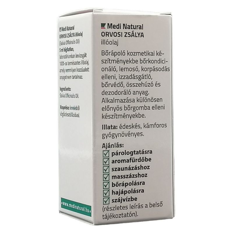 100%-os orvosi zsálya illóolaj (Salvia Officinalis Oil). Hígítatlan, természetes összetételű, hozzáadott anyagokat nem tartalmaz.