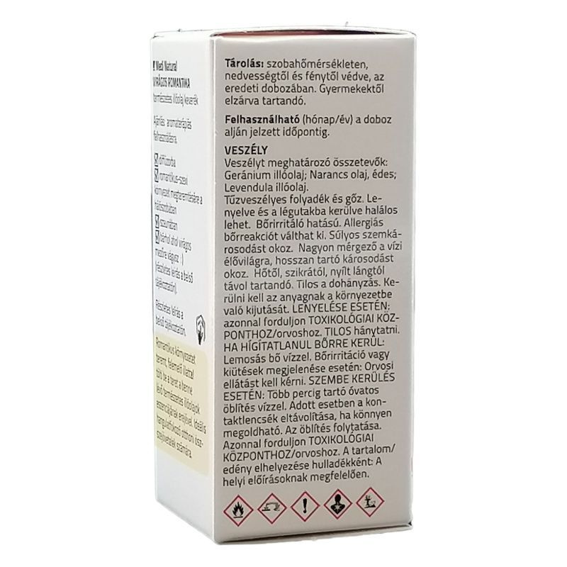 A MediNatural Virágos romantika természetes illóolaj keverék illata egyszerűen mennyei! Édes narancs és rózsa illatú geránium romantikus harmóniája az eleven és mégis megnyugtató levendula virág frissességével. A MediNatural Virágos Romantika természetes illóolaj keverék a következő 100%-os Medinatural illóolajokból komponáltuk meg számodra! Narancs (Citrus Aurantium Dulcis Peel Oil), Geránium (Pelargonium odorantissimum oil), Levendula (Lavandula angustifolia oil).