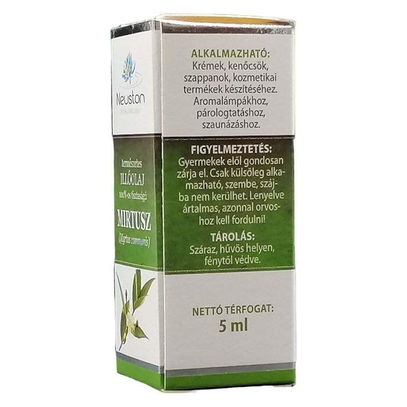 A mirtusz illóolaj kiváló problémás bőrre, mivel összehúzza a pórusokat, csökkenti annak zsírosságát, és növeli tónusát. Ettől bőröd üde, és friss lesz. Fokozza a vérkeringést, ezért nagyon hatásos visszerek esetén. Légúti problémák esetén is hasznát veheted, mivel könnyebbé teszi a légzést. Illata: friss, zöldes, aromás illat, a kámforra emlékeztet.
