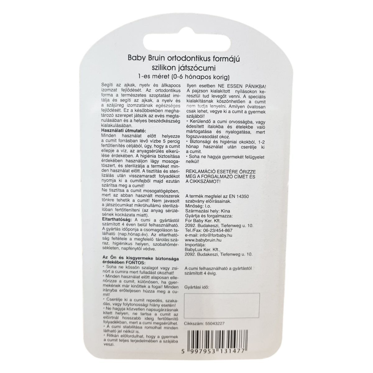 Az ortodontikus kialakítású Baby Bruin játszócumi szilikonból készült és 1-es méretben, 0-6 hónapos korig ajánlott. A termék BPA-mentes, és a természetes szoptatás mozdulatait imitálja, ezzel támogatva a szájüreg izomzatának fejlődését, amelyek fontosak a helyes evés és beszéd fejlődésében. A használati útmutató szerint a higiénia különösen fontos, ezért minden használat előtt alapos tisztítást és sterilizálást igényel. Az anyagsérülés elkerülése érdekében kerülni kell a mosogatógép és mikrohullámú sterilizáló használatát. A cumi biztonságos használata érdekében fontos a rendszeres állapotellenőrzés, az időben történő csere, valamint a veszélyek tudatos elkerülése, mint a fulladásveszély és a fogszuvasodás megelőzése. A cumi megfelel az EN 14350 szabvány előírásainak, minősége I. osztályú, és a megfelelő használat mellett hozzájárul a kisbaba egészséges fejlődéséhez.