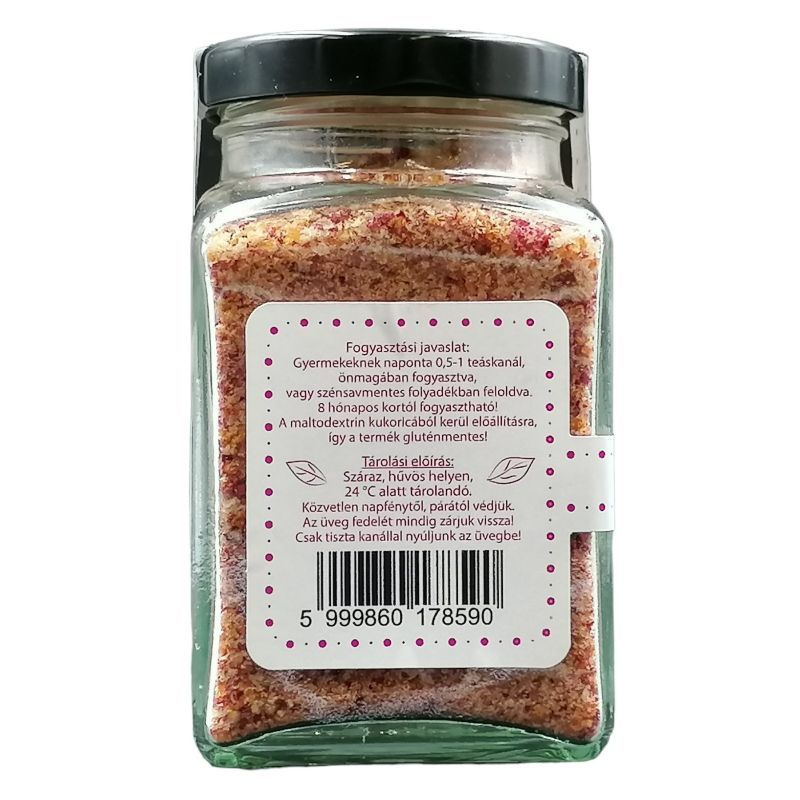 Étrend-kiegészítő kisgyermekek számára. Származási hely: EU. A termék nem tartalmaz hozzáadott cukrot, színezéket, tartósítószert vagy egyéb adalékanyagot. A sótartalom kizárólag a nátrium természetes jelenlétéből adódik. A maltodextrin kukoricából kerül előállításra.