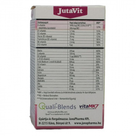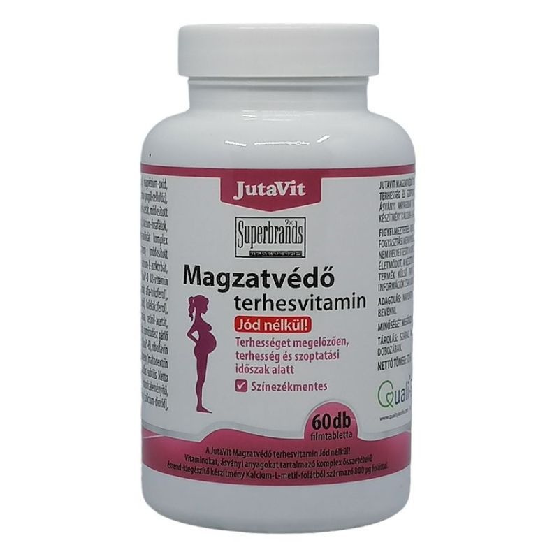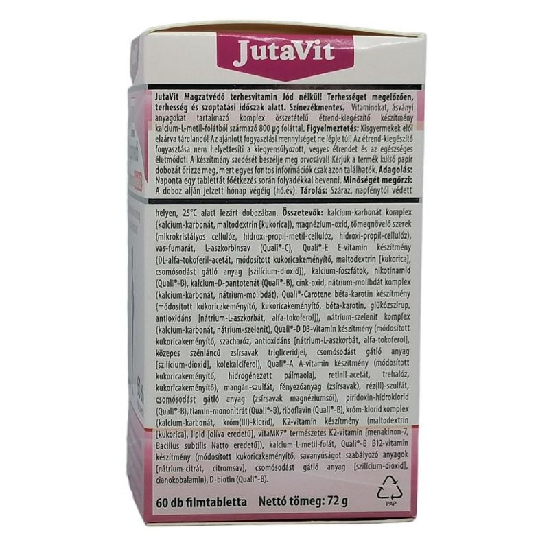 A JutaVit magzatvédő terhesvitamin vitaminokat, ásványi anyagokat tartalmazó komplex összetételű étrend-kiegészítő készítmény Metafolin-ból származó 800μg folsavval.