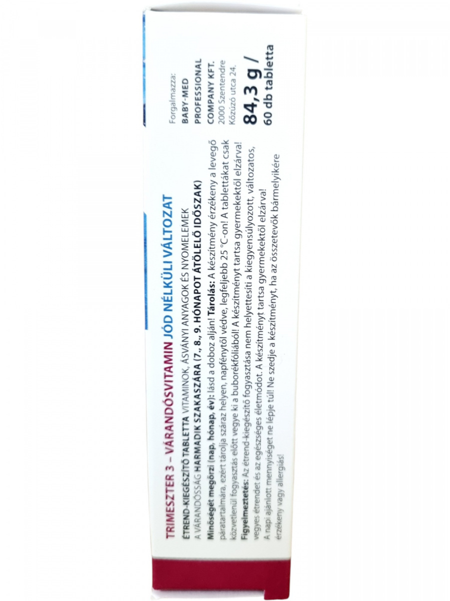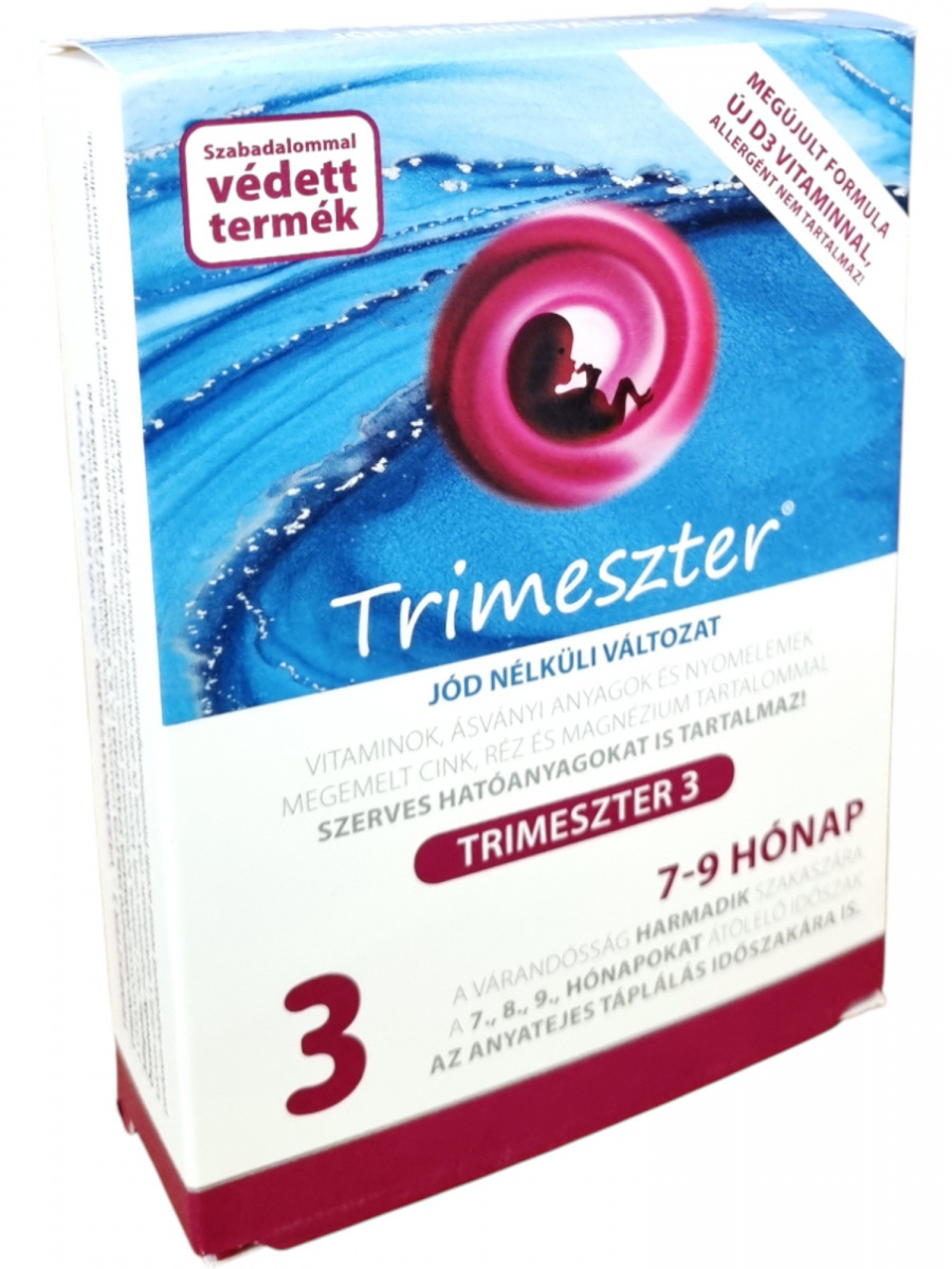 A Trimeszter 3 jódmentes várandósvitamin a terhesség utolsó trimeszterére (7–9. hónap) készült. Megemelt cink-, réz- és magnéziumtartalmával segíthet a kismama és a magzat igényeinek kielégítésében. A készítmény hozzájárulhat az immunrendszer, a csontozat és az izmok normál működéséhez, valamint a fáradtság és kifáradás csökkentéséhez. A folsav támogatja a normál vérképződést és a sejtosztódást, a vas és a réz pedig a normál vörösvérsejt- és hemoglobinképződést. A termék szabadalmaztatott formula, allergén- és színezékmentes, így kifejezetten biztonságos választás a várandósság harmadik szakaszára, valamint az anyatejes táplálás időszakára is ajánlott.