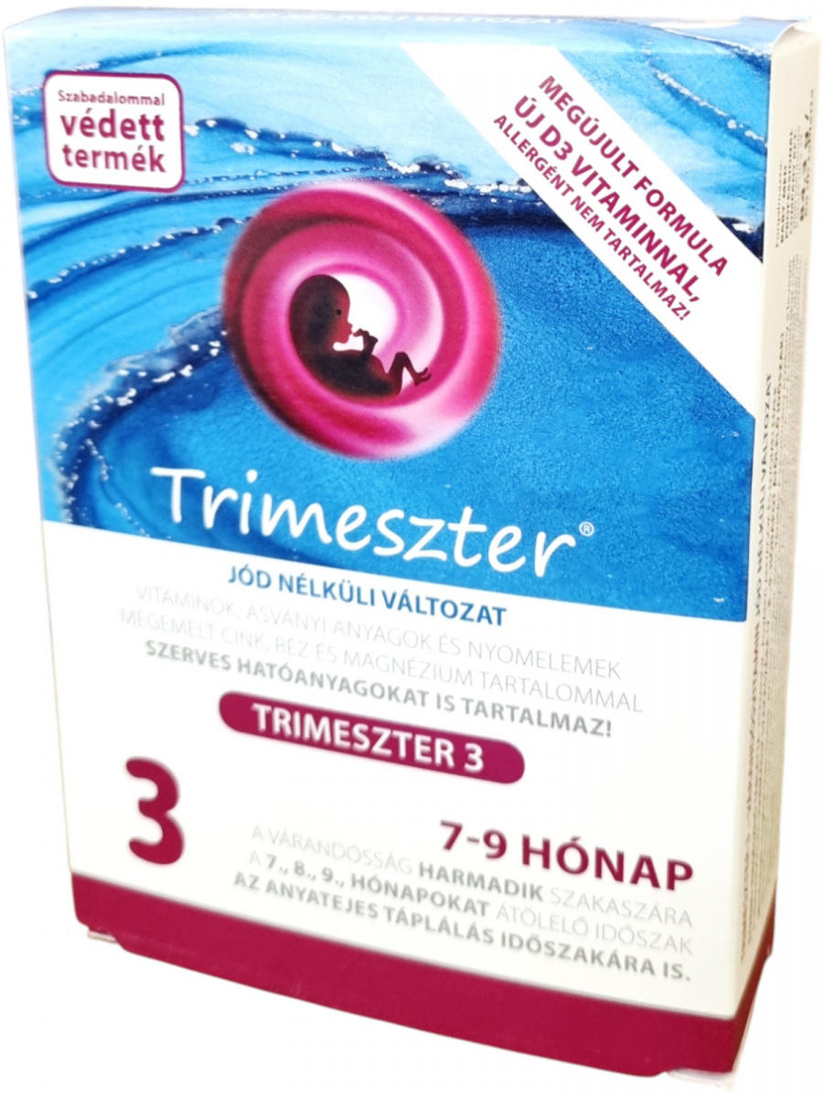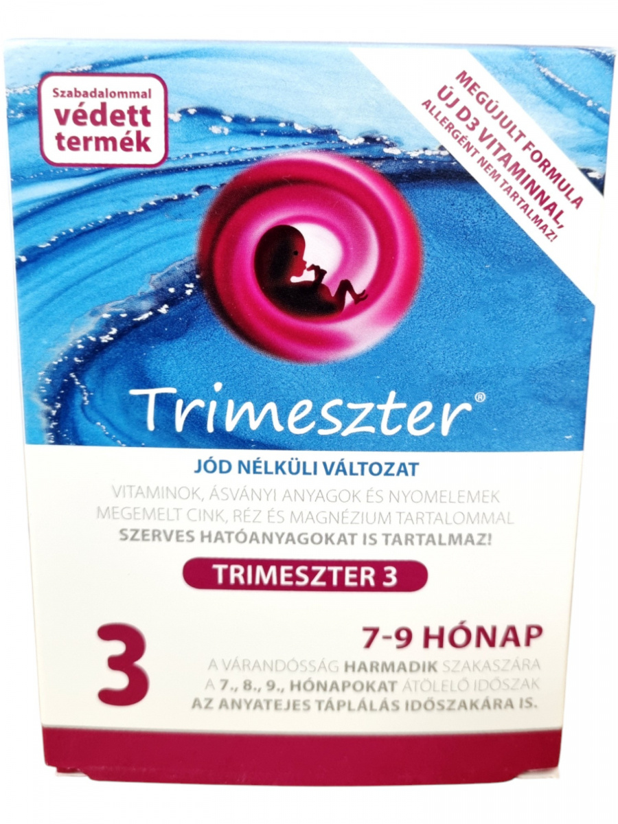 A Trimeszter 3 a várandósság harmadik szakaszára (7–9. hónap) kifejlesztett komplex készítmény, amely vitaminokat, ásványi anyagokat és nyomelemeket tartalmaz. Megemelt cink-, réz- és magnéziumtartalommal, allergénmentesen.