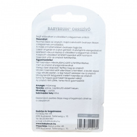 I. osztályú minőségű Baby Bruin orrszívó, amely kisgyermekek orrából segít eltávolítani a váladékot. Anyaga műanyag, származási helye Kína. Reklamáció esetén meg kell őrizni a forgalmazó adatait és a cikkszámot. Az importőr BabyLux Ker. Kft.