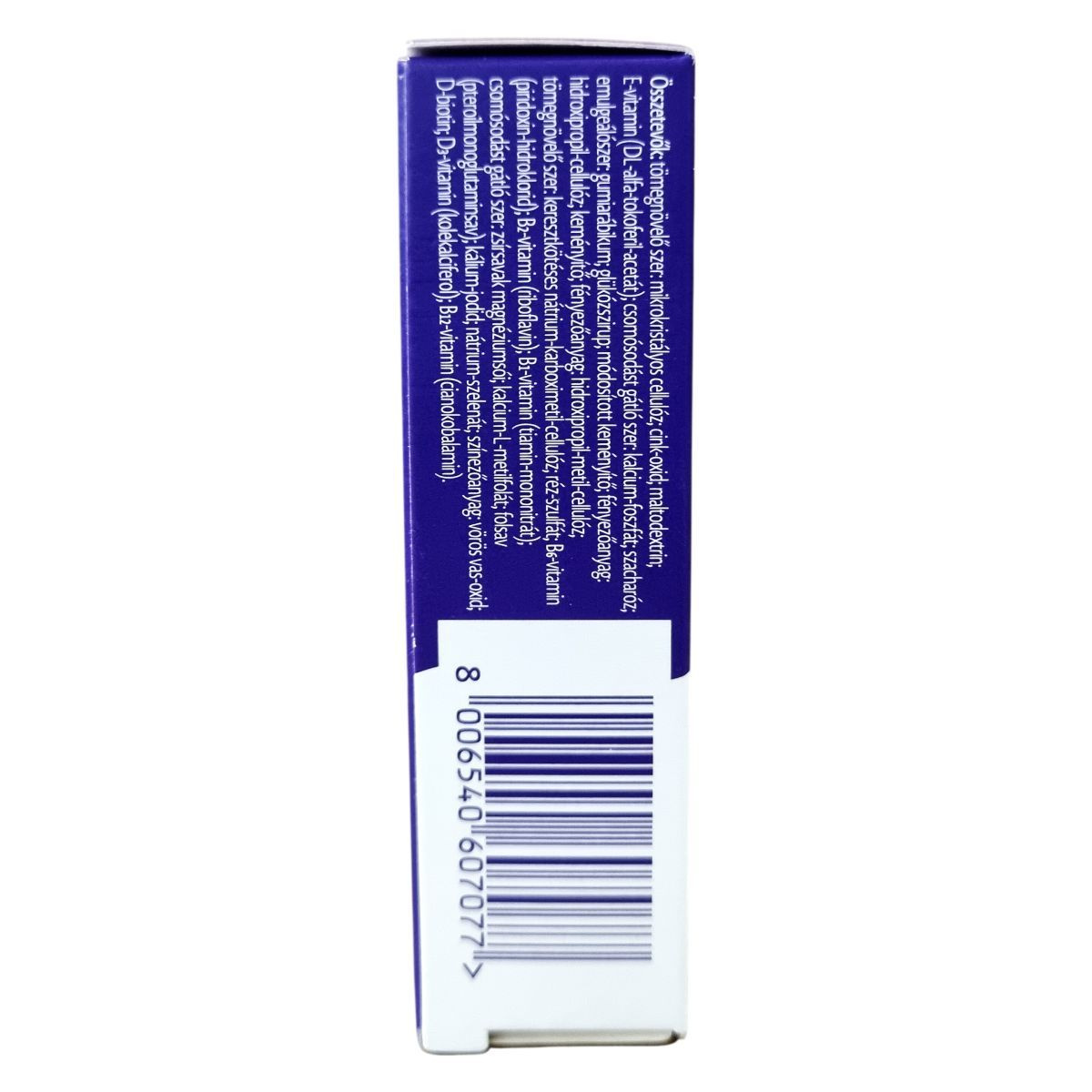 mikrokristályos cellulóz, cink-oxid, maltodextrin, DL-alfa-tokoferil-acetát, kalcium-foszfát, szacharóz, gumiarábikum, glükózszirup, módosított keményítő, keményítő, hidroxipropil-cellulóz, hidroxipropil-metil-cellulóz, keresztskötéses nátrium-karboximetil-cellulóz, réz-szulfát, pirimidoxin-hidroklorid, riboflavin, tiamin-mononitrát, zsírsavak magnéziumsói, kalcium-L-metilfolát, pteroilmonoglutaminsav, kálium-jodid, nátrium-szelénát, vörös vas-oxid, D-biotin, kolekalciferol, cianokobalamin
