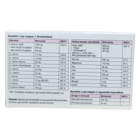 kalcium ortofoszforsavval alkotott sója, kalcium-karbonát, magnézium-oxid, L-aszkorbinsav, mikrokristályos cellulóz, mannit, hidroxi-propil-metil-cellulóz, vas(II)-fumárat, cink-szulfát, hidroxi-propil-cellulóz, zsírsavak szacharóz-észterei, poliszorbát 80, DL-alfa-tokoferil-acetát, nikotinamid, polivinilpolipirrolidon, maltodextrin, zsírsavak magnézium sója, talkum, kalcium-szilikát, szilícium-dioxid, nátrium-aluminium-szilikát, réz(II)-glukonát, zselatin, módosított kukoricakeményítők, kalcium-D-pantotenát, polietilénglikol, mangán-szulfát, rizskeményítő, kukoricakeményítő, béta-karotin, piridoxin-hidroklorid, szacharóz, tiamin-mononitrát, riboflavin, közepes láncú trigliceridek, glükózszirup, retinil-acetát, vas-oxid-sárga, vas-oxid-vörös, kalcium-L-metil-folát (Extrafolate-S®), pteroilmonoglutaminsav, nátrium-aszkorbát, alfa-tokoferol, butil hidroxi-toluol, kálium-jodid, D-biotin, nátrium-szelenit, trinátrium-citrát, citromsav, kolekalciferol, cianokobalamin, halolaj, glicerin, tokoeferolban gazdag kivonat, víz, citromaroma
