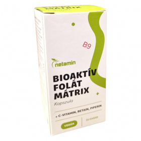 A Netamin Bioaktív Folát Mátrix kapszula egy vegán étrend-kiegészítő, amely folátot, C-vitamint, betaint és feketebors kivonatot tartalmazhat. A folát hozzájárulhat a normál vérképződéshez, a homocisztein-anyagcseréhez, a pszichológiai funkciók fenntartásához, és szerepet játszhat a sejtosztódásban. Terhesség alatt részt vehet az anyai szövetek növekedésében. A C-vitamin és a folát támogathatják az immunrendszer normál működését, valamint csökkenthetik a fáradtság és kifáradás érzését. A termék 30 kapszulát tartalmaz, és a Natural Herbal Kft. forgalmazza.
