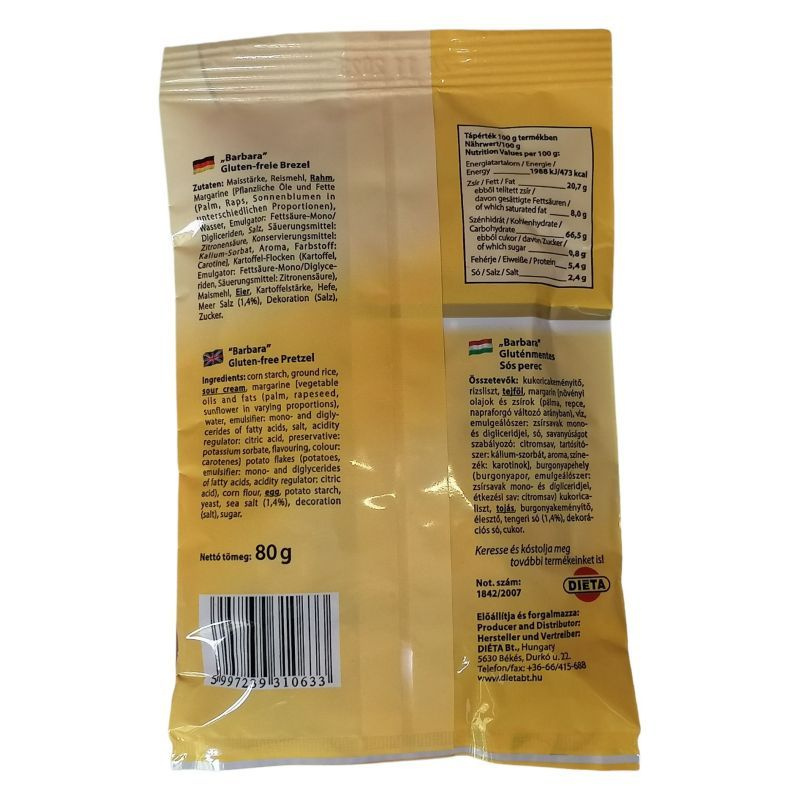 Összetevők: kukoricakeményítő, rizsliszt, tejföl, margarin (finomított növényi olajok és részlegesen hidrogénezett növényi zsírok, víz, emulgeálószerek: zsírsavak mono-, és digliceridjei és szójalecitin, só (0, 4%), tartósítószer: kálium-szorbát, savanyúságot szabályozó: citromsav, színezék: annatto, aroma), burgonyapehely (burgonyapor, emulgeálószer: zsírsavak mono-, és digliceridjei, stabilizátor: dinátrium-difoszfát, tartósítószerek: nátrium-szulfit és nátrium-hidrogén-szulfit, étkezési sav: citromsav), kukoricaliszt, tojás, burgonyakeményítő, élesztő, tengeri só (1, 4%), dekorációs só, cukor.