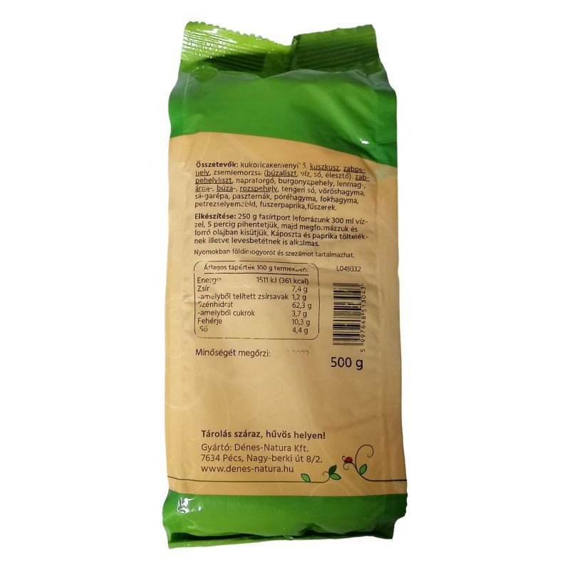 Összetevők: szójagranulátum, (20 %) étkezési keményítő, zsemlemorzsa (búzaliszt, só, víz, élesztő), napraforgómag, burgonyaliszt, árpa, -búza, -rozs, -zab és lenpehely, tengeri só, pirospaprika és Dénes Natura ételízesítő fűszerkeverék.
