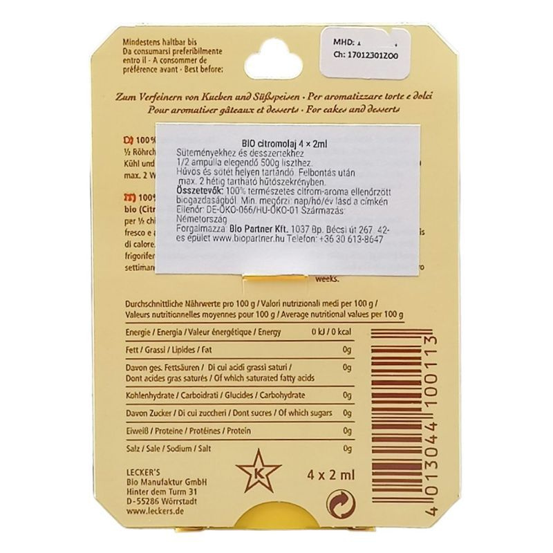 A Leckers bio étkezési citromolaj egy prémium minőségű, 100%-os természetes citromolaj, amely tökéletes választás mindazok számára, akik szeretnék felfrissíteni ételeiket és italjaikat. Az olaj a legjobb minőségű citromokból készül, így gazdag ízvilágot és aromát kínál. A citromolaj nemcsak az ételek ízesítésére alkalmas, hanem számos más felhasználási lehetőséggel is rendelkezik. Az ampullák praktikus kiszerelése lehetővé teszi, hogy mindig friss és intenzív ízélményt nyújtson, anélkül, hogy a felhasználónak nagyobb mennyiséget kellene tárolnia. A citromolaj frissítő hatása és citrusos illata azonnal felélénkíti a hangulatot, így ideális választás lehet a konyhában, de akár a fürdőszobában is, ahol a természetes aromák segíthetnek a relaxációban.