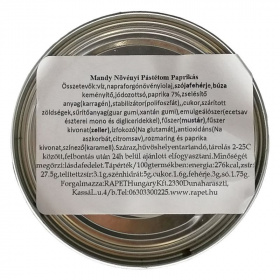 A Mandy növényi pástétom paprikás változata egy ízletes és tápláló alternatíva a hagyományos húsos pástétomok helyett. Ez a különleges pástétom gazdag ízvilágával és krémes állagával minden falatban élvezetet nyújt. A pirospaprika, amely a termék 7%-át teszi ki, nemcsak színt, hanem karakteres ízt is ad a pástétomnak, így minden falatban érezhető a paprika fűszeres aromája. A pástétom alapját képező szójafehérje és búzakeményítő biztosítja a megfelelő állagot, míg a napraforgóolaj gazdag zsírsavtartalmával hozzájárul a termék ízletes és krémes textúrájához. A Mandy növényi pástétom nemcsak ízletes, hanem tápláló is, hiszen a benne található összetevők segítenek a kiegyensúlyozott táplálkozásban. A pástétom nem tartalmaz állati eredetű összetevőket, így vegetáriánusok és vegánok számára is ideális választás lehet. A fűszerek és az antioxidánsok, mint a nátrium-aszkorbát és a citromsav, hozzájárulnak a termék frissességéhez és eltarthatóságához, miközben a rozmaring és paprika kivonat különleges ízélményt nyújtanak.