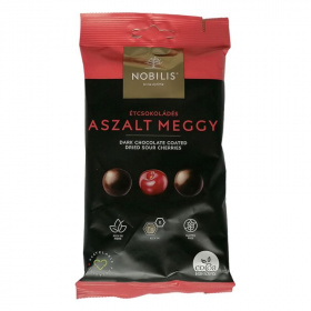 Összetevők: Étcsokoládé min.: 50% (kakaómassza, cukor, kakaóvaj, emulgeálószer: szójalecitin, aroma), aszalt, magozott meggy, fényezőanyag: sellak, keményítő.
