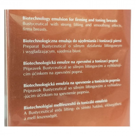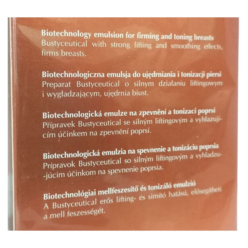 A Bustyceutical emulzió biotechnológiai eredetű peptidszintézisből jött létre. A termék a következő összetevőkből áll: biotechnológiai bakteriális, stimuláló és növekedési tényezőkben gazdag szüredék, az oxigént igénylő mikroorganizmusok kultúrájából nyert specifikus tápláló anyag. Kétféle amfifilikus biopeptid. Ennek a biopeptidnek a jelenléte a Bustyceuticalban biztosítja a kollagén sejt-metabolizmusának serkentését a bőr rétegeiben.