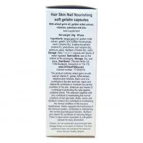 A Dr.Chen Haj Bőr Köröm tápláló lágyzselatin kapszula természetes E-vitamin tartalmú búzacsíra olajat, aranyköles kivonatot, vitaminokat és ásványi anyagokat tartalmaz. A biotin és a cink hozzájárulhat a bőr és a haj, míg a niacin és a B2-vitamin a bőr normál állapotának fenntartásához. A szelén és az E-vitamin együtt hozzájárulhatnak a sejtek oxidatív stresszel szembeni védelméhez, valamint a szelén a cinkkel együtt a haj és a köröm normál állapotának fenntartásához. A biotin, a niacin és a riboflavin (B2-vitamin) támogathatják a nyálkahártyák normál állapotának fenntartását. A niacin segítheti az idegrendszer működését, hozzájárulhat a normál pszichológiai funkció fenntartásához, míg a riboflavin és a B5-vitamin csökkenthetik a fáradtságot és a kifáradást. A készítmény hatóanyagai lágyzselatin kapszulában találhatók, amelyek a könnyű felszívódást szolgálják.