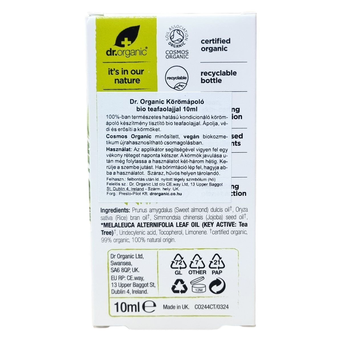 A Dr. Organic Körömápoló bio teafaolajjal 100%-ban természetes hatású kondicionáló készítmény, mely ápolja, védi és erősíti a körmöket. A termék Cosmos Organic minősítésű és vegán biokozmetikum újrahasznosítható csomagolásban. A használat során az applikátor segítségével kell naponta kétszer vékony réteget felvinni a körmökre, majd a körmök javulása után is folytatni a kezelést még két-három hétig. Ha bőrirritáció lép fel, az alkalmazást azonnal abba kell hagyni. A terméket száraz, hűvös helyen kell tartani, és kerüljük a szembe jutását. A készítmény 10 ml-es kiszerelésű és az Egyesült Királyságban készült.