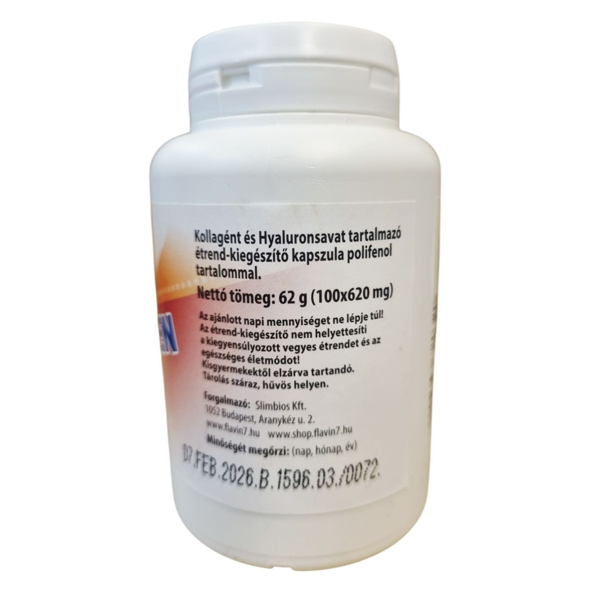 Kollagén, HPMC kapszula (hipromellóz, cink-oxid, sűrítőanyag: karragén, emulgeálószer: glicerin), Flavin 7 bioflavonoid komplex (vörös szőlő mag-héj szárítmány, cirok mag-héj szárítmány, feketeszeder mag-héj szárítmány, fekete cseresznye héj szárítmány, feketeribizli mag-héj szárítmány, pirosribizli mag-héj szárítmány, szilva héj szárítmány, almahéj szárítmány), hyaluronsav (90%).
