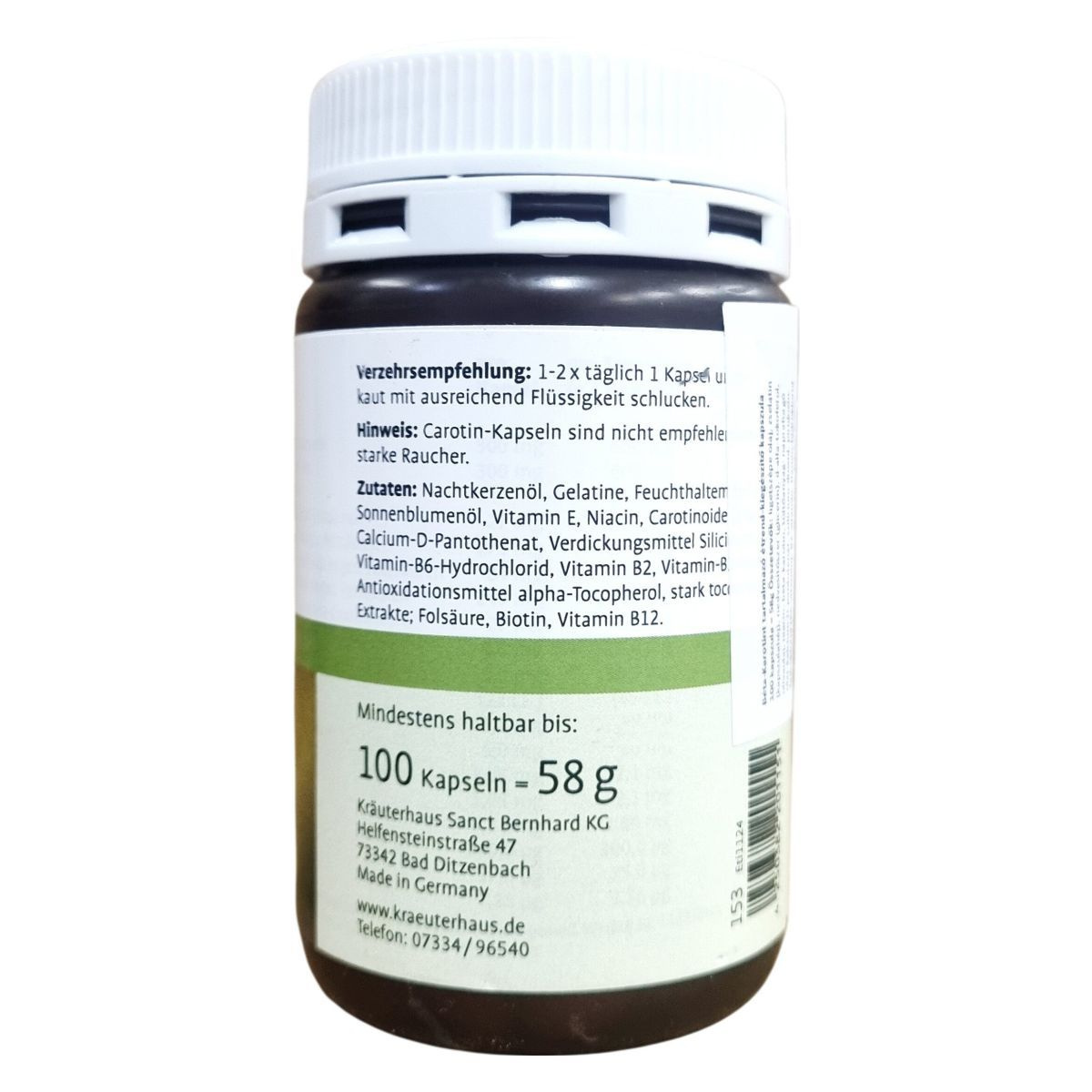 A Carotin kapszula németországi gyártmány, amely karotinoidokat és vitaminokat tartalmaz. Az étrend-kiegészítő kapszula 100 darabos kiszerelésben kapható. A termék tájékoztatása szerint rágás nélkül, megfelelő mennyiségű folyadékkal javasolt bevenni. A készítmény alapvető összetevői közé tartoznak a növényi olajok, vitaminok és antioxidáns hatású anyagok. A használat során fontos figyelembe venni, hogy az ajánlott napi mennyiséget nem szabad túllépni, és a termék nem helyettesíti a kiegyensúlyozott étrendet vagy az egészséges életvitelt.