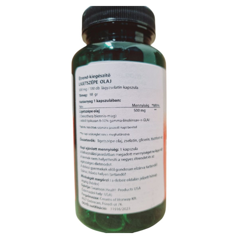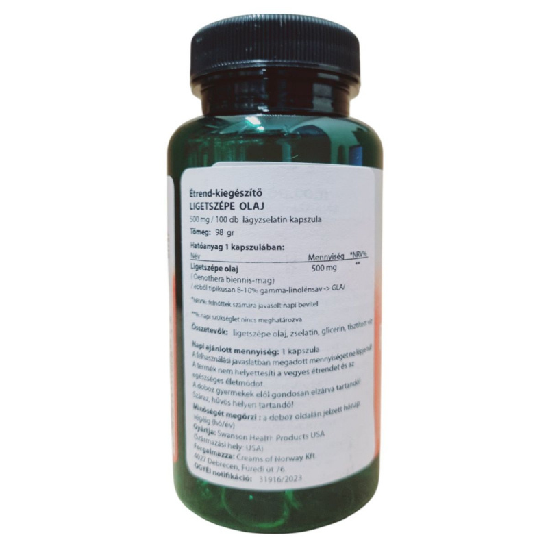 A Swanson Ligetszépe Olaj kapszula egy étrend-kiegészítő, amely 500 mg ligetszépe olajat tartalmaz, amelyből 8-10% gamma-linolénsav (GLA) származhat. A termék napi egy kapszula fogyasztását javasolja, és nem helyettesíti a vegyes étrendet vagy az egészséges életmódot. A kapszulák összetevői között megtalálható a zselatin, glicerin és tisztított víz. A terméket száraz, hűvös helyen kell tárolni, és gyermekek elől elzárva tartani. A Swanson Health Products által gyártott és a Creams of Norway Kft. által forgalmazott termék OGYÉI notifikációval rendelkezik.