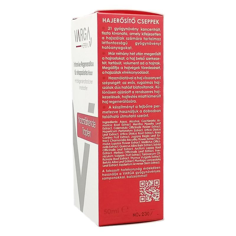 A Varga Hajerősítő Cseppek 21 gyógynövény tiszta, koncentrált kivonata, amely kifejezetten a hajszálak számára tartalmaz létfontosságú gyógynövényi hatóanyagokat. Néhány hét alatt megerősíti a hajrostokat és a haj belső szerkezetét. Megállítja a hajvégek töredezését, a hajszálak elvékonyodását. Különösen ajánlott a rendszeres hajkezelések, hajfestés miatt kimerült haj regenerálására. Nagyon hasznos a hajhullás megelőzésében is!