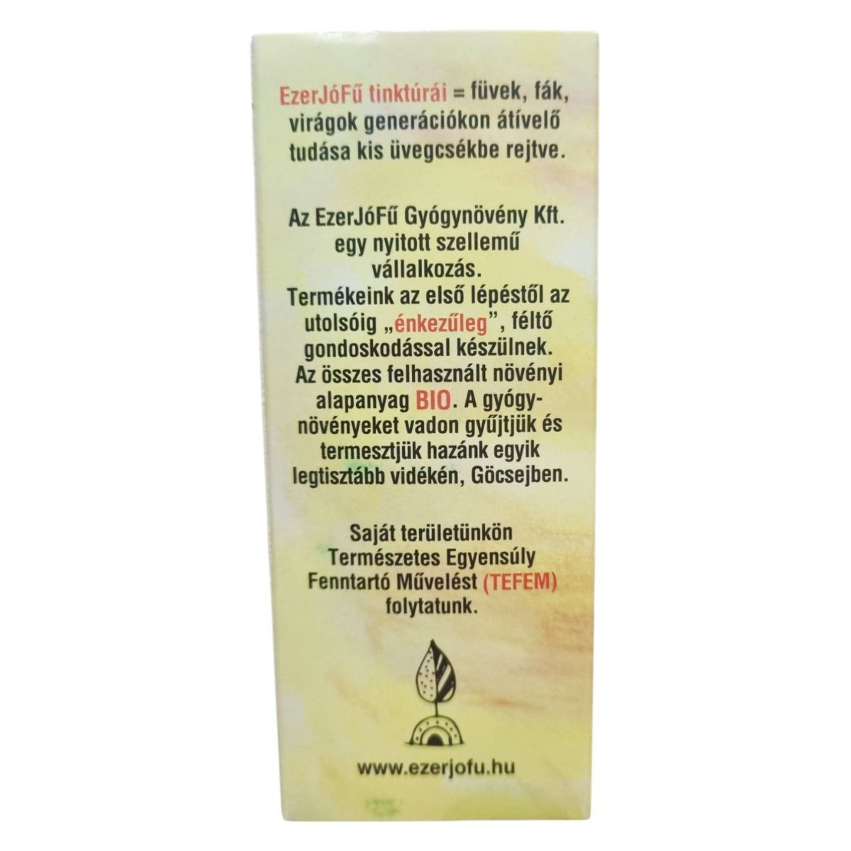 Az EzerJóFű Feketedió Tinktúra egy természetes alapanyagokból készült étrend-kiegészítő, amely a feketedió terméshéjának kivonatát tartalmazza. Az EzerJóFű Gyógynövény Kft. termékei a természetes egyensúly fenntartására törekednek, és a Göcsej régió tiszta környezetéből származó bio alapanyagokból készülnek. A tinktúra alkoholtartalma 36 V/V %, ezért alkalmazása nem javasolt alkoholbetegeknek, terhes és szoptató nőknek, valamint gyermekeknek. A termék fogyasztása nem helyettesíti a kiegyensúlyozott vegyes étrendet és az egészséges életmódot.